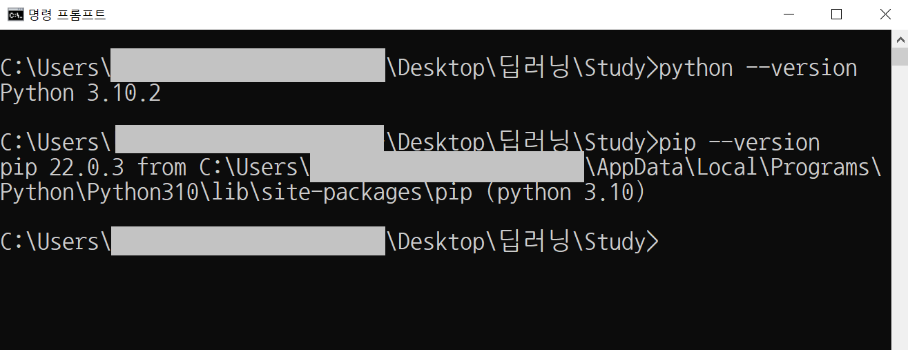 필자는 이미 Python 3.10.2를 설치한 상태다. 설치가 정상적으로 완료되었다면 명령 프롬프트(CMD)를 실행한 뒤에 다음과 같이 python --version과 pip --version 명령어를 입력하여 버전을 확인한다.