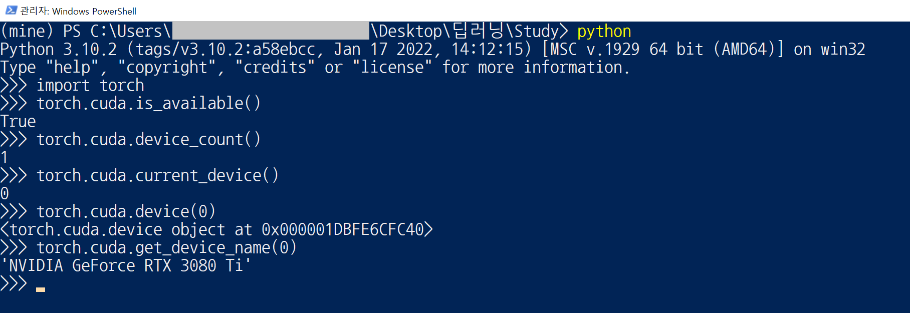 필자는 다음과 같이 NVIDIA GeForce RTX 3080 Ti라는 이름으로 GPU 장치(device)가 잡히는 것을 알 수 있다. 이상으로 딥러닝 PyTorch 개발 환경 구축이 완료되었다.