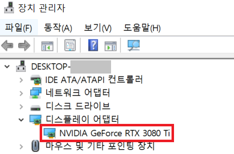 딥러닝 개발 환경을 구축하기 전에, 가장 먼저 자신의 컴퓨터 시스템 환경을 확인할 필요가 있다. 윈도우 운영체제에서 [장치 관리자]를 실행하면 다음과 같이 그래픽 카드에 대한 정보가 나온다. 필자는 NVIDIA GeForce RTX 3080 Ti를 사용하고 있다.