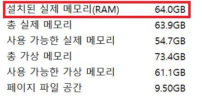 이어서 자신이 사용 중인 메인 메모리(RAM)의 용량도 나오는 것을 확인할 수 있다.