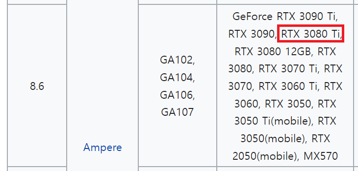 다음과 같이 RTX 3080 Ti는 8.6 Compute Capability에 해당한다고 알려주는 것을 알 수 있다.