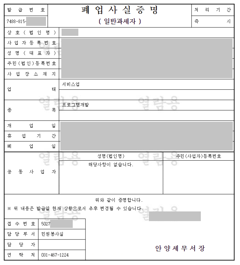 결과적으로 다음과 같이 [폐업 사실 증명서]가 웹으로 출력된다.