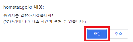 이후에 [확인] 버튼을 눌러 증명서를 열람한다.