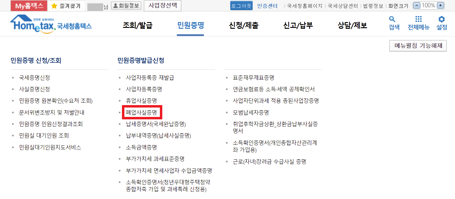 개인사업자의 경력을 증빙하기 위하여 "폐업사실증명서"를 제출해야 하는 경우가 있다. 이럴 때는 홈택스에 로그인을 한 뒤에 [민원증명] - [폐업사실증명]으로 들어간다.