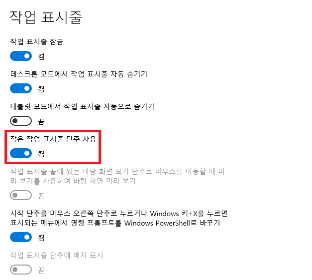 또한 작업 표시줄의 크기 자체를 줄이고 싶다면 [작은 작업 표시줄 단추 사용] 버튼을 누른다. 그러면 작업 표시줄에 존재하는 아이콘(단추)의 크기가 작아지므로, 작업 표시줄 자체의 높이(height)도 작아지는 효과가 있다.
