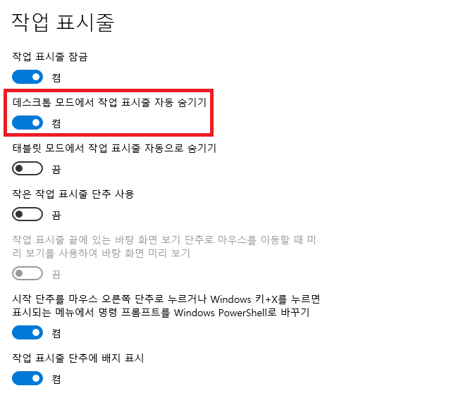 이후에 [작업 표시줄 설정] 창에서 [데스크톱 모드에서 작업 표시줄 자동 숨기기]를 누른다. 그러면 평소에는(마우스를 아래쪽으로 내리기 전에는) 작업 표시줄이 화면에 보이지 않기 때문에, 컴퓨터 화면을 더욱 넓은 화면으로 볼 수 있게 된다. 예를 들어 웹 브라우저를 실행하면 작업 표시줄의 위쪽까지만 웹 브라우저 화면이 가득 차게 되는데, 작업 표시줄을 숨기게 되면 웹 브라우저가 화면을 가득 채우기 때문에, 더욱 넓은 화면에서 웹 서핑을 할 수 있다.