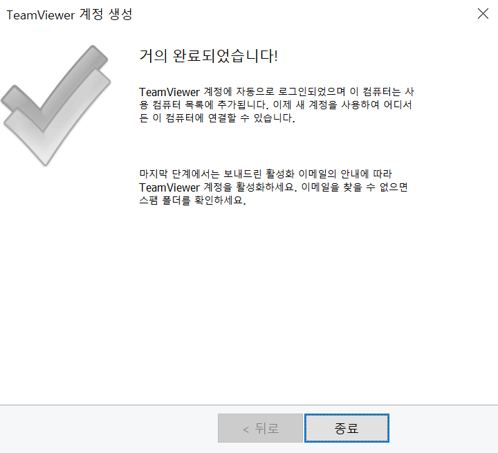 결과적으로 팀뷰어 계정 생성이 완료되면 [종료] 버튼을 누르면 된다.