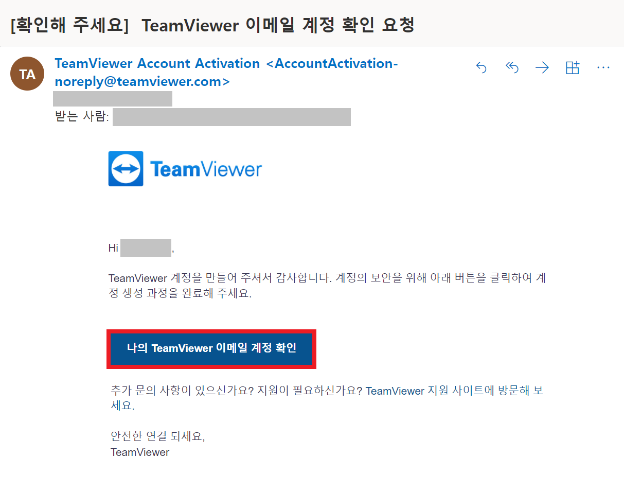 그러면 다음과 같이 팀뷰어 계정 확인 요청 메일이 도착한다. [이메일 계정 확인] 버튼을 누르면 된다.