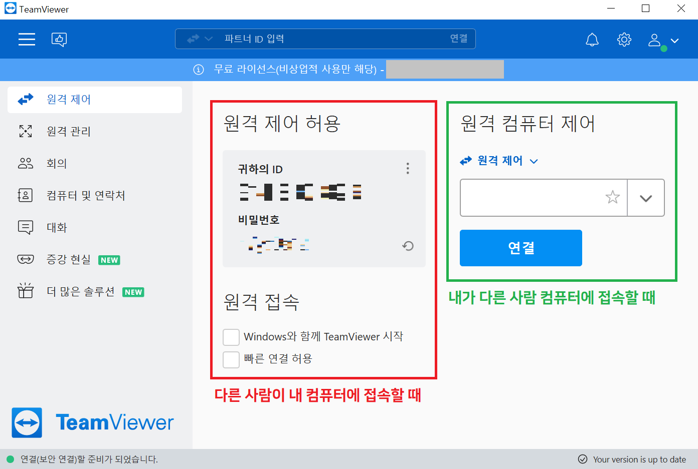 다른 사람이 내 컴퓨터에 접속할 때는 나의 [아이디(ID)]와 [비밀번호]를 알려주면 된다. 반대로 내가 접속할 때는 상대방 컴퓨터의 [아이디(ID)]를 입력하고 [연결]을 누른 뒤에, [비밀번호]를 입력하여 원격으로 접속할 수 있다.