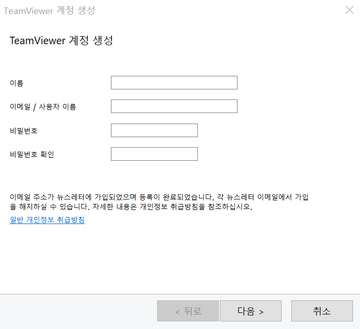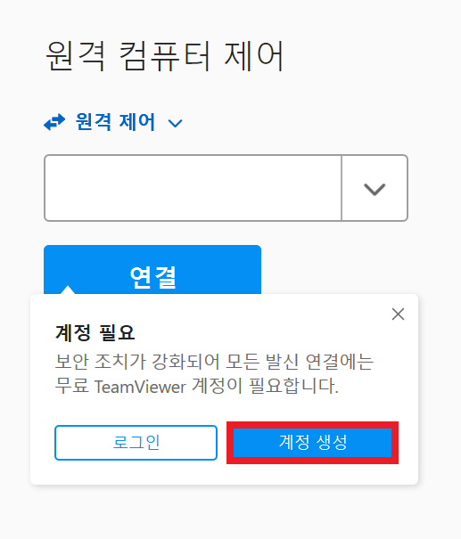 최근 팀뷰어를 이용하기 위해서는 [계정]이 필요하다. 따라서 [계정 생성]을 진행한다.