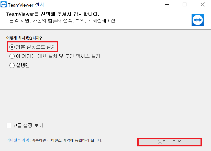 팀뷰어를 설치할 때는 간단히 [기본 설정으로 설치]를 진행할 수 있다.