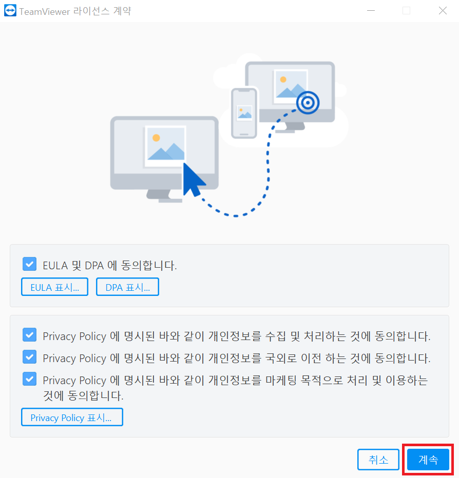 이후에 팀뷰어 라이센스(license)을 확인한 뒤에 동의하고 [계속] 버튼을 누른다.