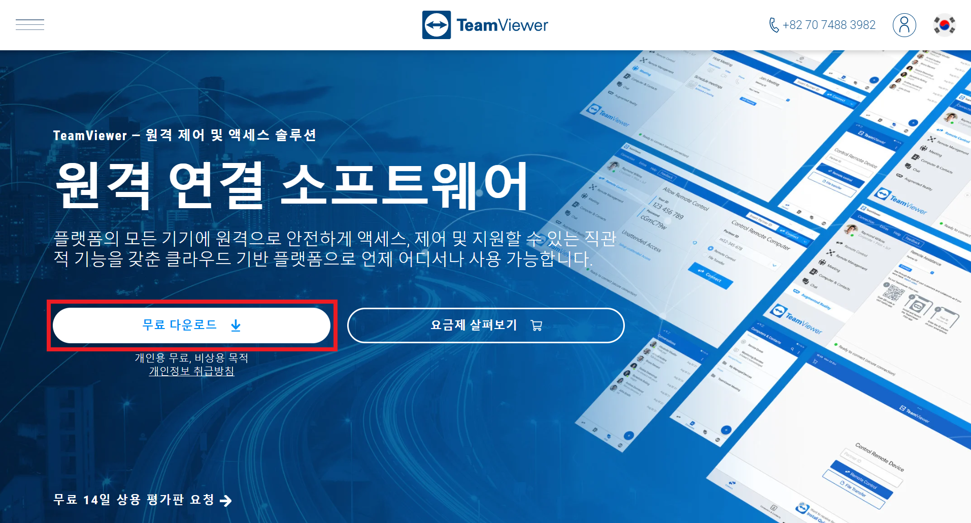팀뷰어 홈페이지에 접속하여 [무료 다운로드] 버튼을 누른다.