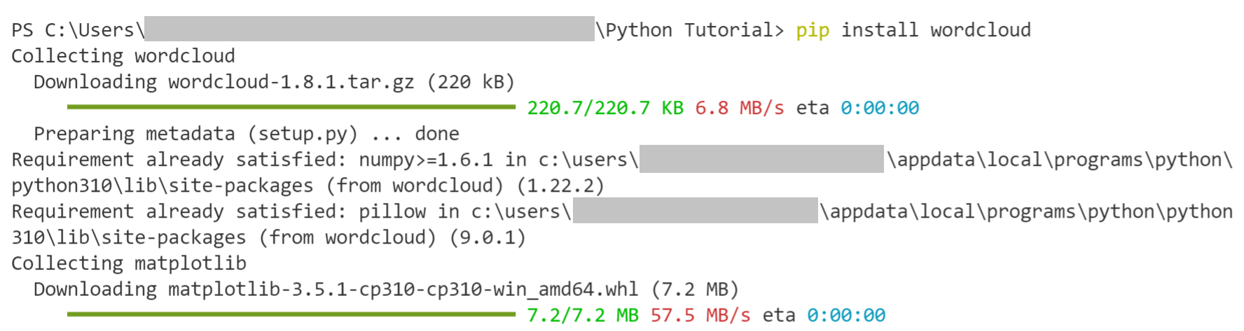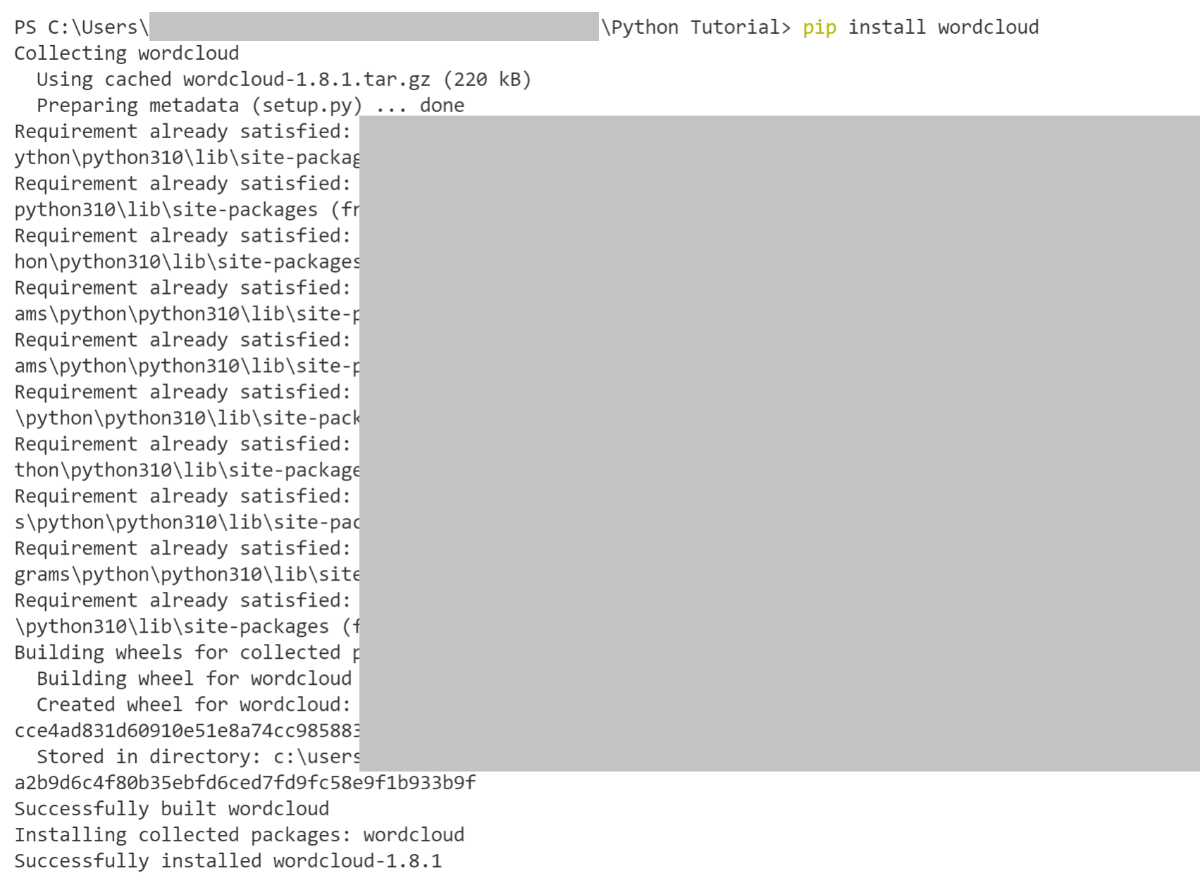 컴퓨터 재시작 이후에 다시 wordcloud 라이브러리를 설치하면 정상적으로 설치가 완료된다.