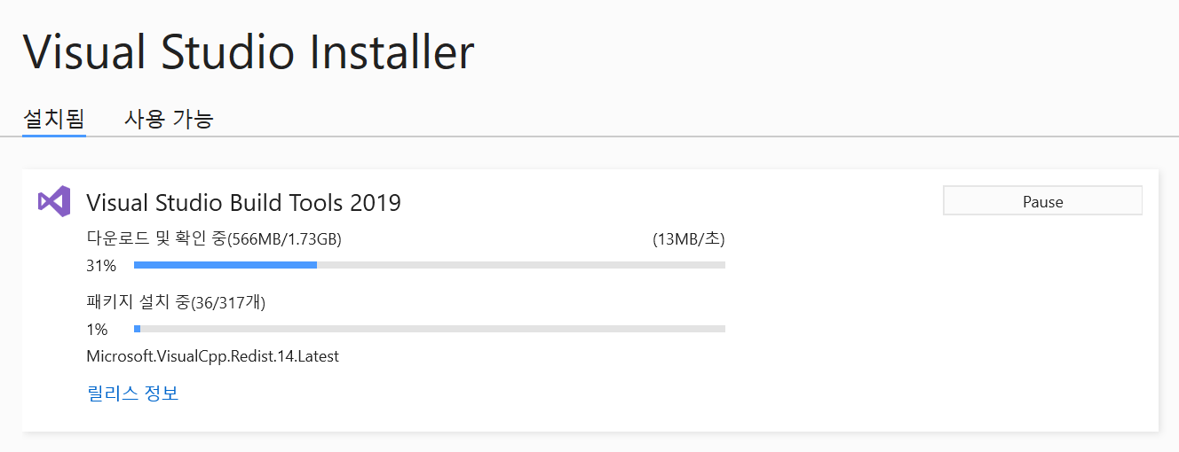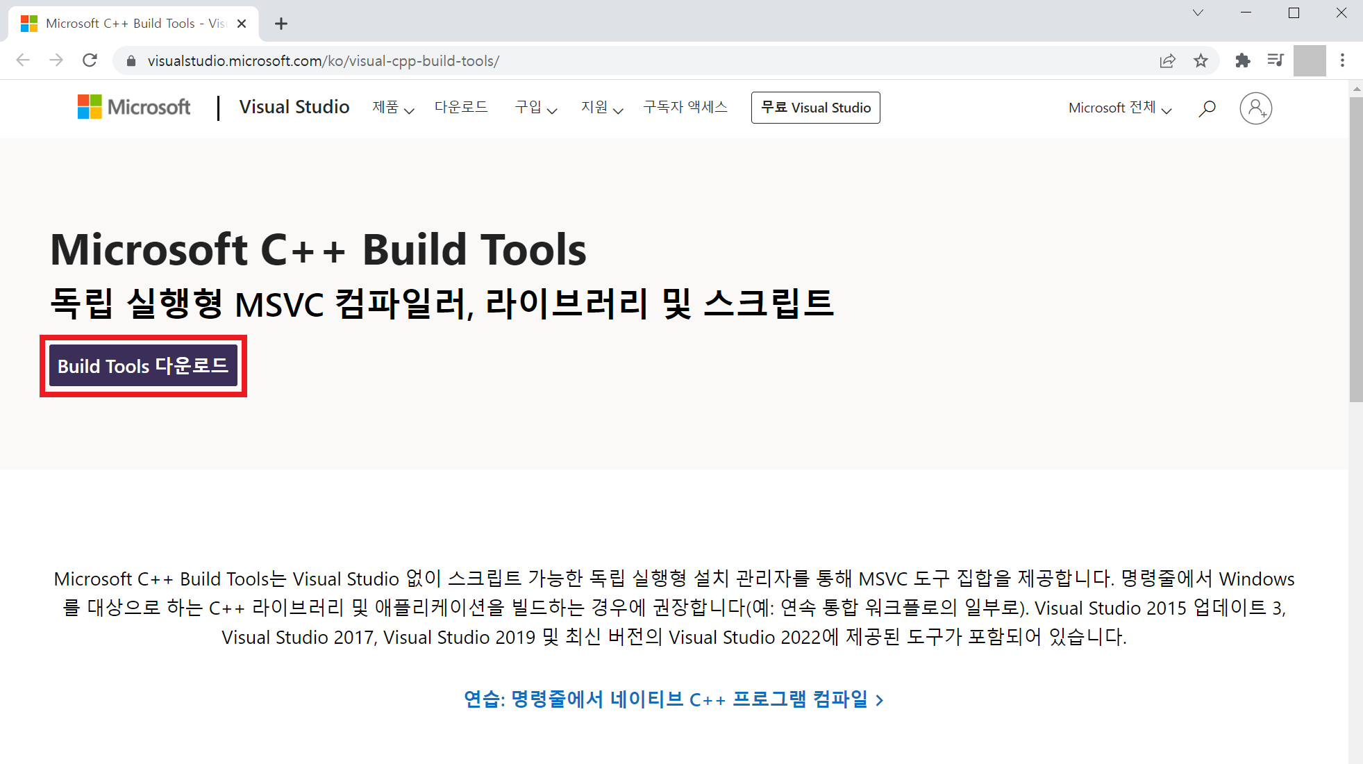 ▶ Microsoft C++ Build Tools 설치: https://visualstudio.microsoft.com/ko/visual-cpp-build-tools/