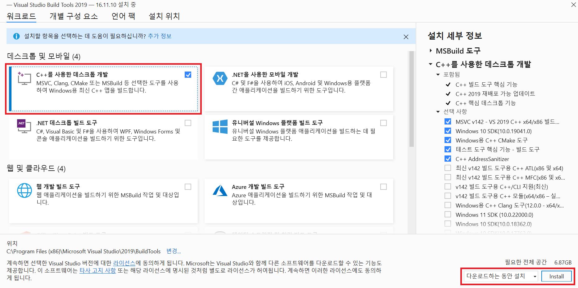 결과적으로 Visual Studio Installer가 실행되면, 다음과 같이 [C++를 사용한 데크스톱 개발]을 선택하면 된다. 우리가 필요한 건 C++ 빌드 환경이기 때문이다. 결과적으로 [다운로드하는 동안 설치] 버튼을 누르고 [Install]을 진행하면 된다.