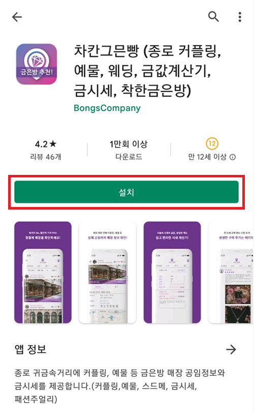 금 시세를 검색할 때는 네이버나 [차칸그믄빵] 앱을 사용할 수 있다. 참고로 [차칸그믄빵] 앱에서는 종로에 존재하는 다양한 금은방(귀금속상가) 정보를 보여준다. 그래서 다양한 금은방을 돌면서 가격을 비교한 뒤에 그 정보를 앱에 기록해 놓았다가 최종적으로 구매하면 된다. [차칸그믄빵] 앱은 다음과 같이 생겼다. (필자가 이 앱을 실행했을 때는 금의 시세가 아래와 같았다.)