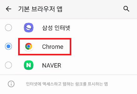 그러면 다음과 같이 설치된 [웹 브라우저] 중에서 자신이 [기본 앱]으로 사용할 브라우저를 선택할 수 있게 된다. 필자는 이미 크롬(Chrome)을 기본 브라우저 앱으로 사용하고 있다.
