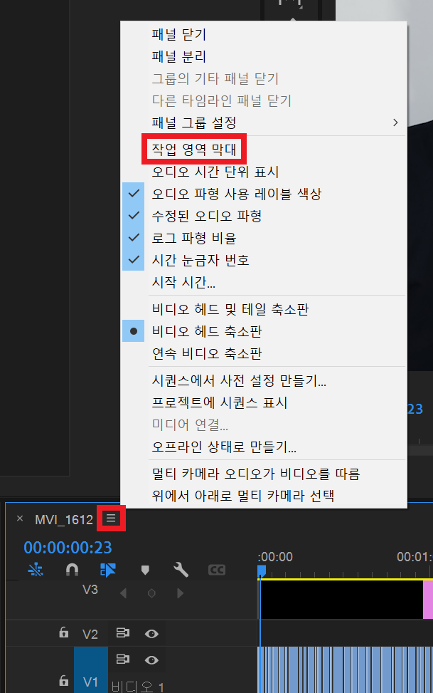 어도비 프리미어(Adobe Premiere)에서는 동영상 내에서 특정한 부분만 [작업 영역 막대]를 이용해 동영상으로 내보낼 수 있습니다. 방법은 굉장히 간단합니다. 참고로 편집 화면의 타임라인에 작업 영역 막대가 보이지 않는다면, [햄버거] 버튼을 클릭한 뒤에 [작업 영역 막대]를 클릭하면 됩니다.