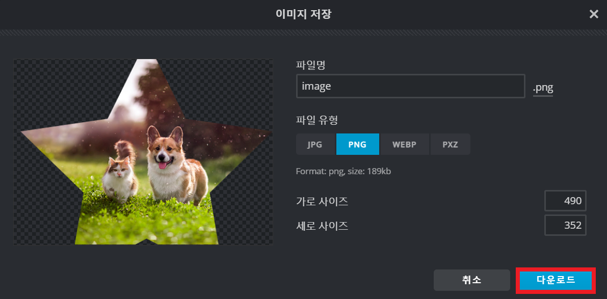 다음과 같이 이미지 파일을 저장할 수 있습니다. 원하는 이미지 파일 유형을 선택한 뒤에 [다운로드] 버튼을 누르면 됩니다.