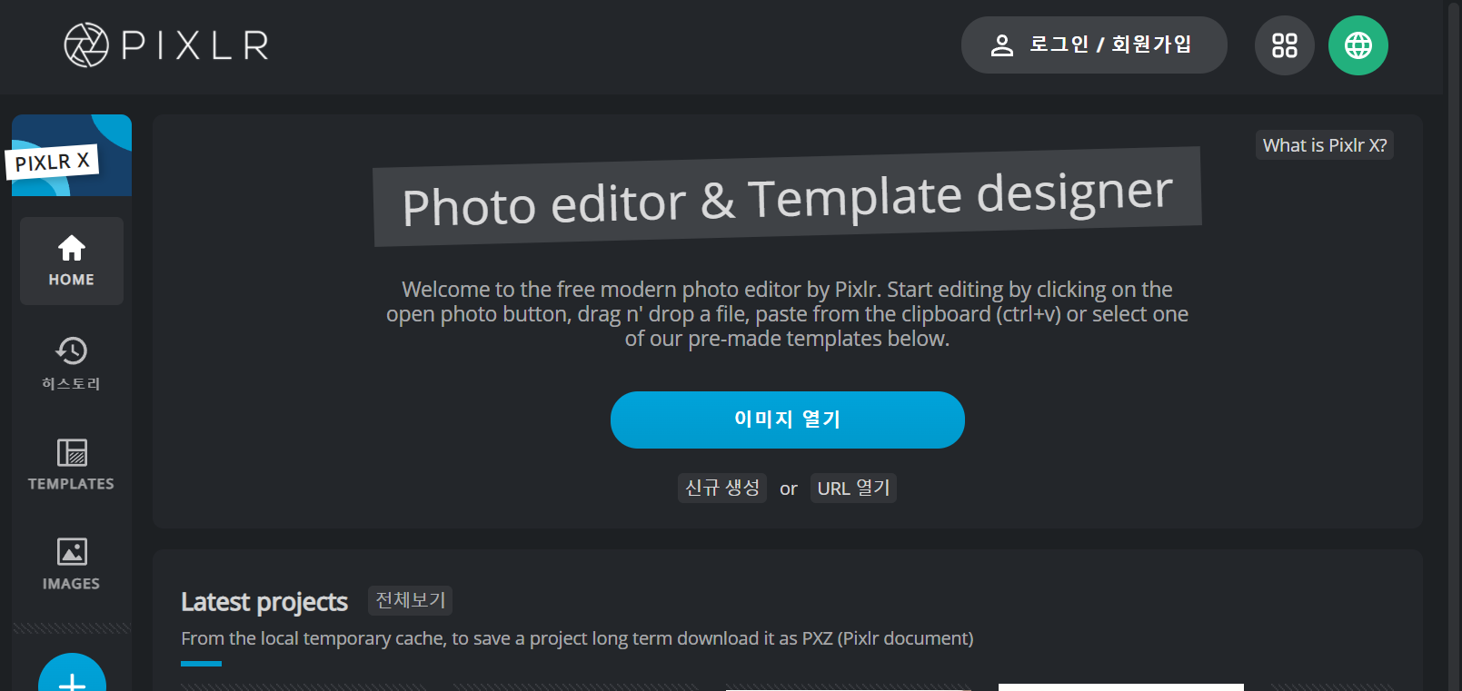 픽슬러에 접속하면 다음과 같은 화면이 나옵니다. 이제 이미지를 불러와 편집을 진행할 수 있습니다.