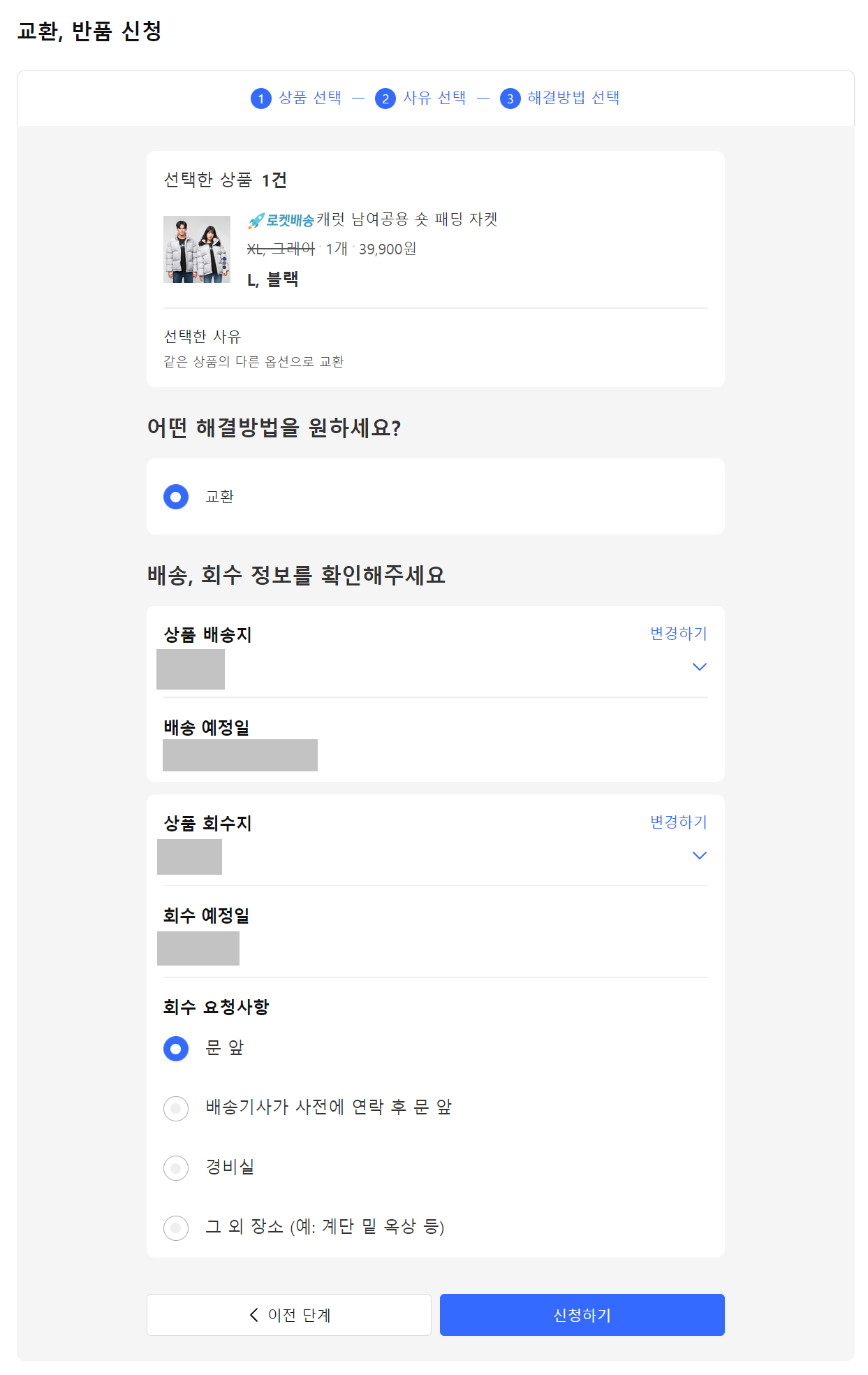 결과적으로 다음과 같이 [교환, 반품 신청서]를 작성할 수 있다. 토요일에 교환 신청을 하니까 바로 그다음날인 일요일을 기준으로 배송과 회수가 이루어진다고 한다. 매우 편리한 것 같다.