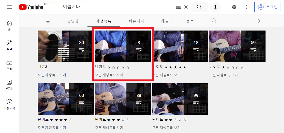 다음과 같이 [어썸기타] 유튜브 채널에 접속한 뒤에 [재생목록]에 들어가면 다양한 기타 강좌가 있다. 어썸기타에서는 난이도별로 곡을 모아 놓기 때문에, 처음 공부하는 입장에서 단계를 밟아 가며 다양한 곡들을 연습할 수 있다.