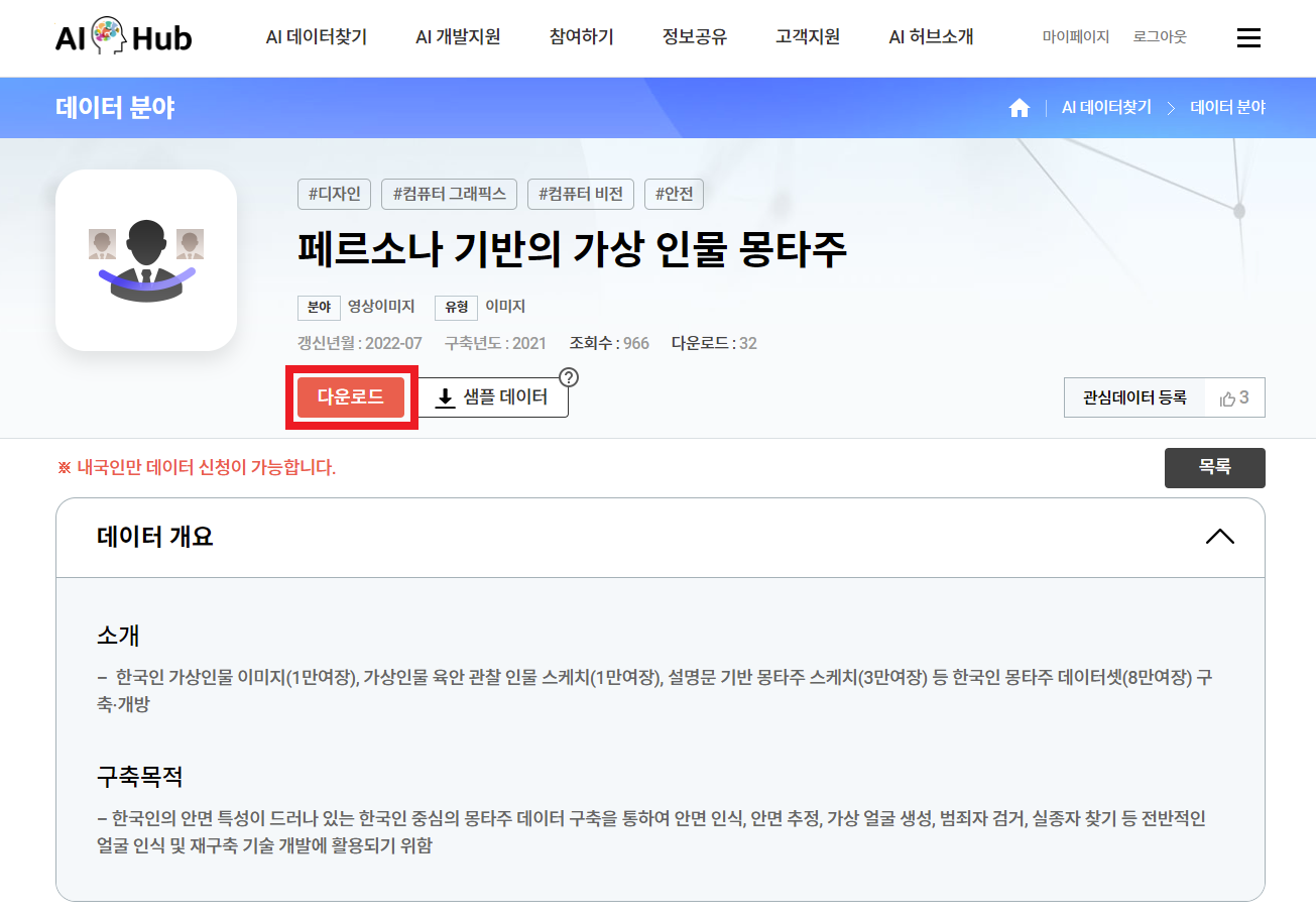 필자는 AI 허브(AI Hub)의 다양한 데이터 세트를 둘러보다가, 재미있는 데이터 세트가 보여서 확인해 보았다. 바로 "페르소나 기반의 가상 인물 몽타주" 데이터 세트인데, 이것을 확인하고 [다운로드]를 진행했다.