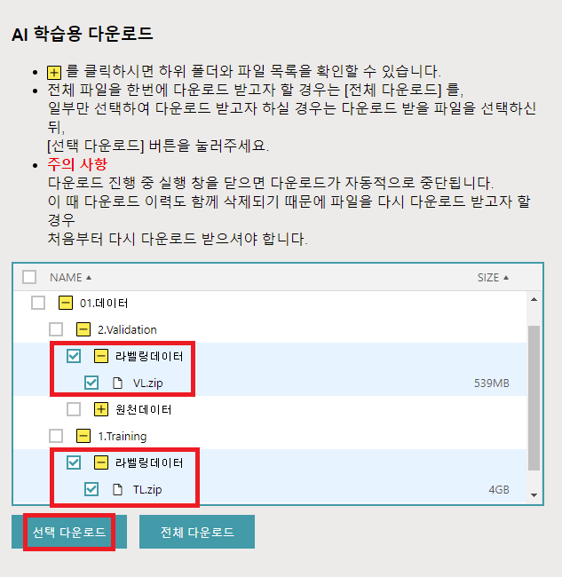 다음과 같이 원하는 데이터를 선택하여 [선택 다운로드]를 진행하면 된다.