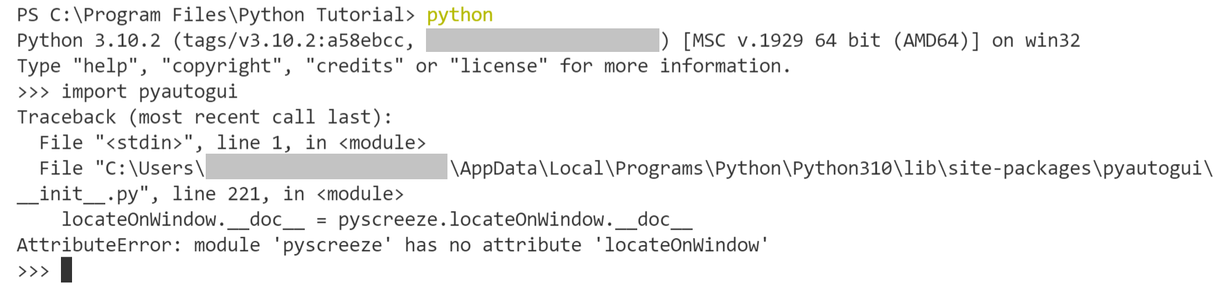 최근에 파이썬 라이브러리 중 하나인 pyautogui를 설치했고, 이를 사용하려고 할 때 다음과 같은 오류가 발생했다. 오류 내용은 다음과 같은데, pyscreeze 모듈에 locateOnWindow라는 속성(attribute)이 없다는 의미다.