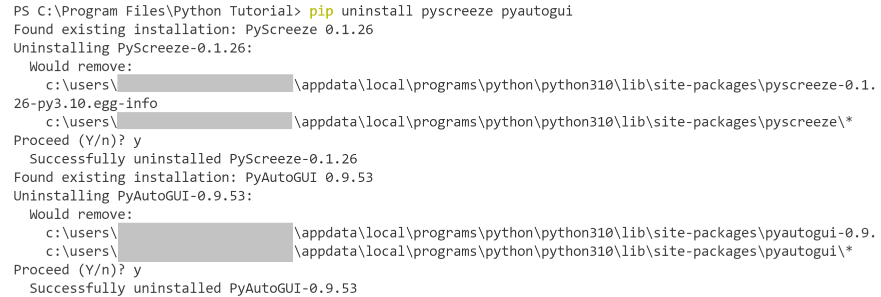 이러한 오류 메시지가 나오는 경우 PyAutoGUI를 설치할 때부터 오류가 발생했을 가능성이 높다. 그래서 문제의 원인이 되는 pyscreeze와 pyautogui를 재설치하는 것이 우선이다. 다음과 같은 명령어로 두 라이브러리를 삭제할 수 있다.