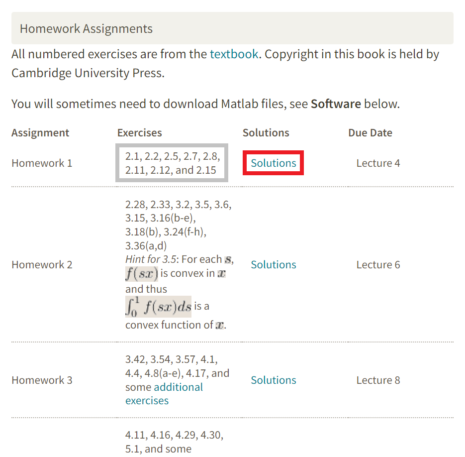 스탠퍼드(Stanford) 대학교에서 강의할 때 출제되었던 숙제(homework) 문제들과 솔루션을 확인할 수 있습니다. 따라서 실제로 스탠퍼드에서의 강의 진도에 맞게 공부를 하면서 적절한 문제를 풀어 보는 것을 추천합니다.
