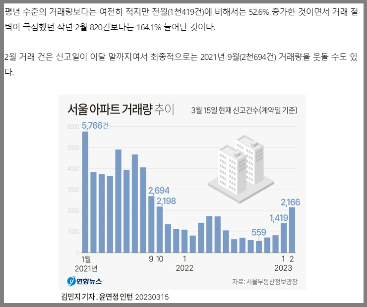 최근 2023년 2월에 서울 부동산 거래량이 늘었다는 뉴스 기사를 접할 수 있었다. 거래량이 늘었다는 것은 실제로 "거래" 자체가 많아졌다는 의미이므로, 많은 거래량 자체는 현재의 가격이 적절한지 여부를 판단할 때 유의미한 지표가 될 수 있을 것이라고 생각한다. 실제로 아래와 같은 뉴스 기사를 쉽게 찾아 볼 수 있었는데, 이것이 사실인지 여부가 궁금했다.