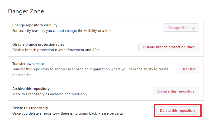 이때, 기본적으로 해당 저장소(repository)를 삭제하면 위키(wiki), 이슈(issue), 코멘트(comment) 등 기본적으로 해당 저장소와 관련 있는 항목들이 영구적으로 삭제되기 때문에, 이러한 내용을 바르게 이해할 필요가 있다.